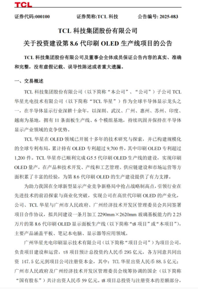 TCL华星与广州市政府签署协议,计划总投资295亿元建设全球首条8.6代印刷OLED产线(t8项目),预计2025年11月开工。