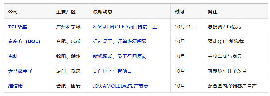 京东方、惠科、天马等厂商均在国庆后快速恢复排产,部分产线甚至进入“加班赶产”状态。